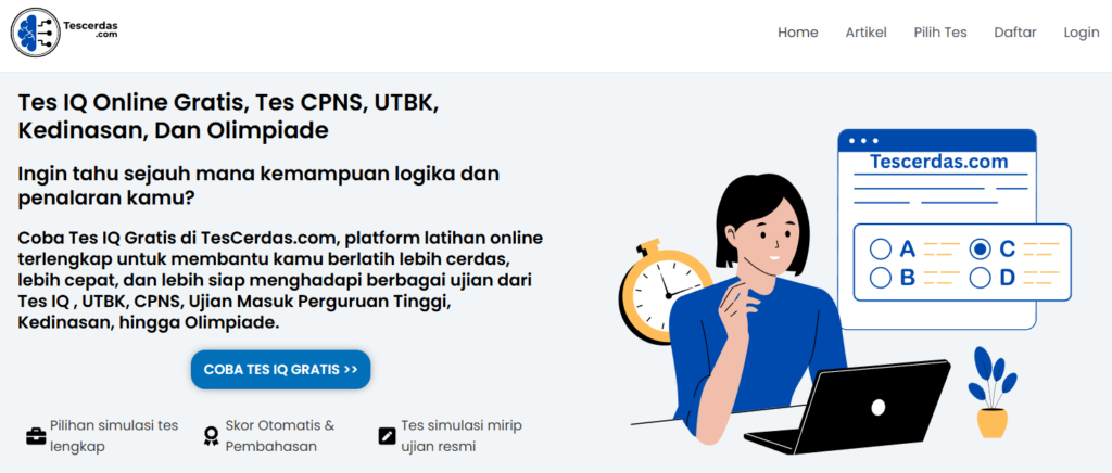 Tescerdas.com adalah website edukasi asal Indonesia yang menyediakan berbagai jenis tes dan latihan soal, termasuk tes IQ online gratis. Berbeda dengan banyak situs tes IQ luar negeri, Tescerdas hadir dengan tampilan yang sederhana, ringan, dan mudah dipahami oleh pengguna Indonesia.